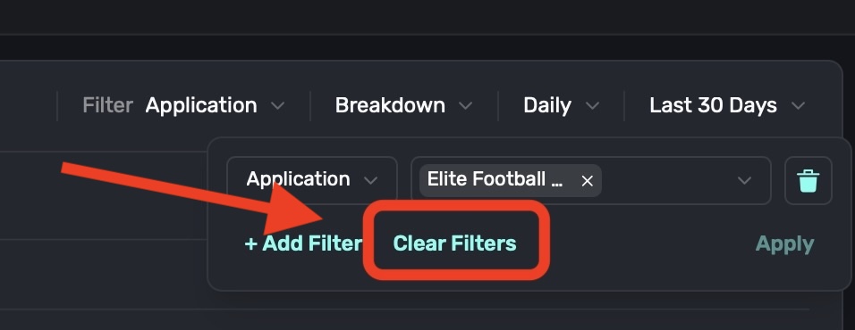 To remove an individual component that's part of a filter (i.e. breaking down by "Application" and removing one of the included apps), click on the X button on its trailing side: