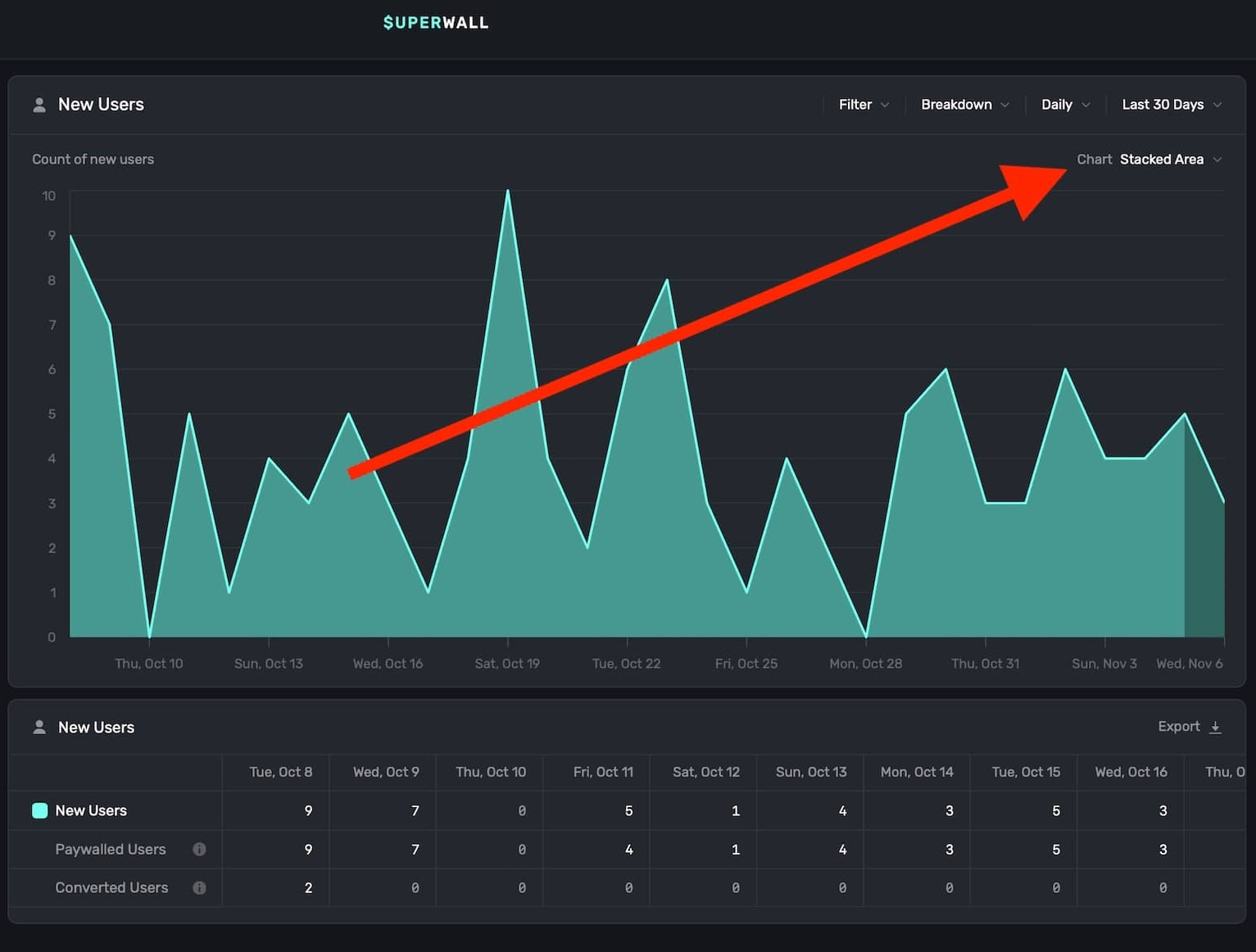 You can toggle the chart format between Stacked Area, Line, Stacked Bar, or Bar. Here is the same chart data in each format: