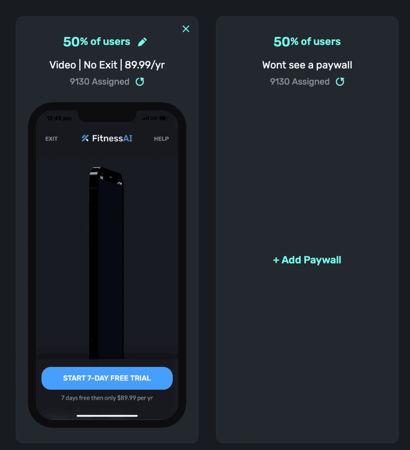 Then, assign percentages from 0%-100% for each of them. In total, your percentages should equal 100 (i.e. paywall A shows 10%, paywall B shows 30%, and paywall c shows 60% of the time) unless you're purposely creating a holdout. When you're done, click the Checkmark icon below any paywall: