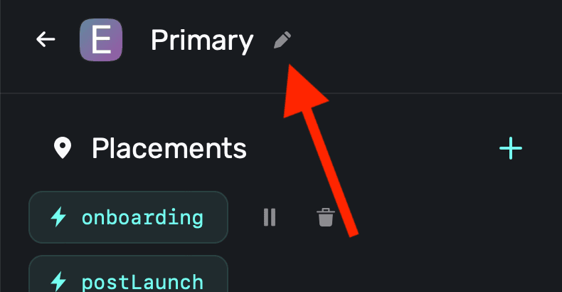 Under the placements section, you can add, pause or delete existing placements. Placements are actions, or implicit events, which you can use to show a paywall or implement feature gating. Be liberal with adding placements, you can always pause them on-the-fly without app updates. Or, if you later decide to paywall a particular feature, it gives you more flexibility if you already have a placement for that particular action.