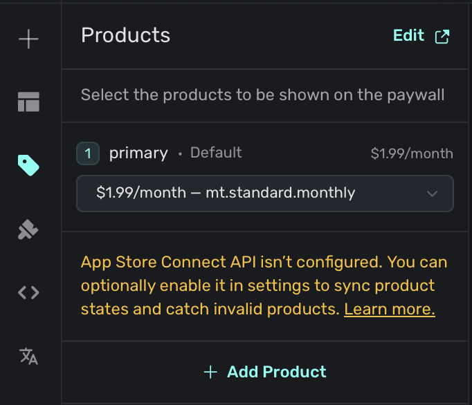 When using Apple-based products, Superwall will automatically fetch the product information from App Store Connect. However, if you haven't set up the App Store Connect API, you may see a message indicating that the product information is missing: