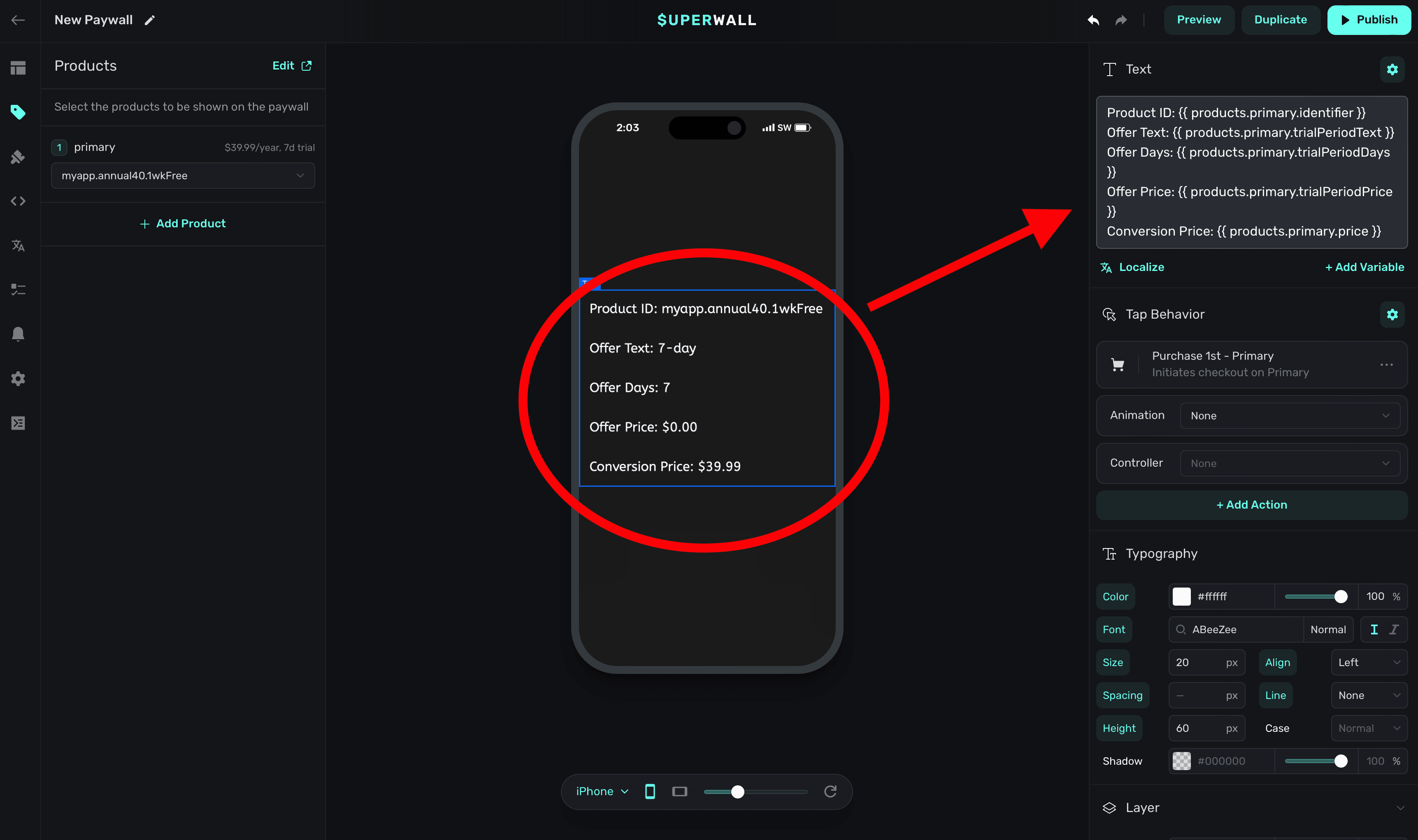 In Superwall, all data for the one-week free trial is found in the trial liquid variables, which are a part of a product. Below, critical details about its duration, offer price and more are shown in the example paywall. Take note of the text box on the right, which shows how these variables can be used:
