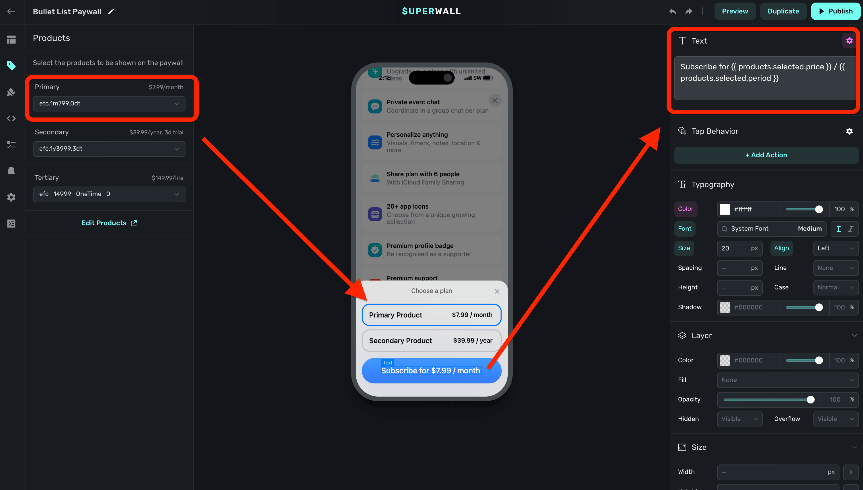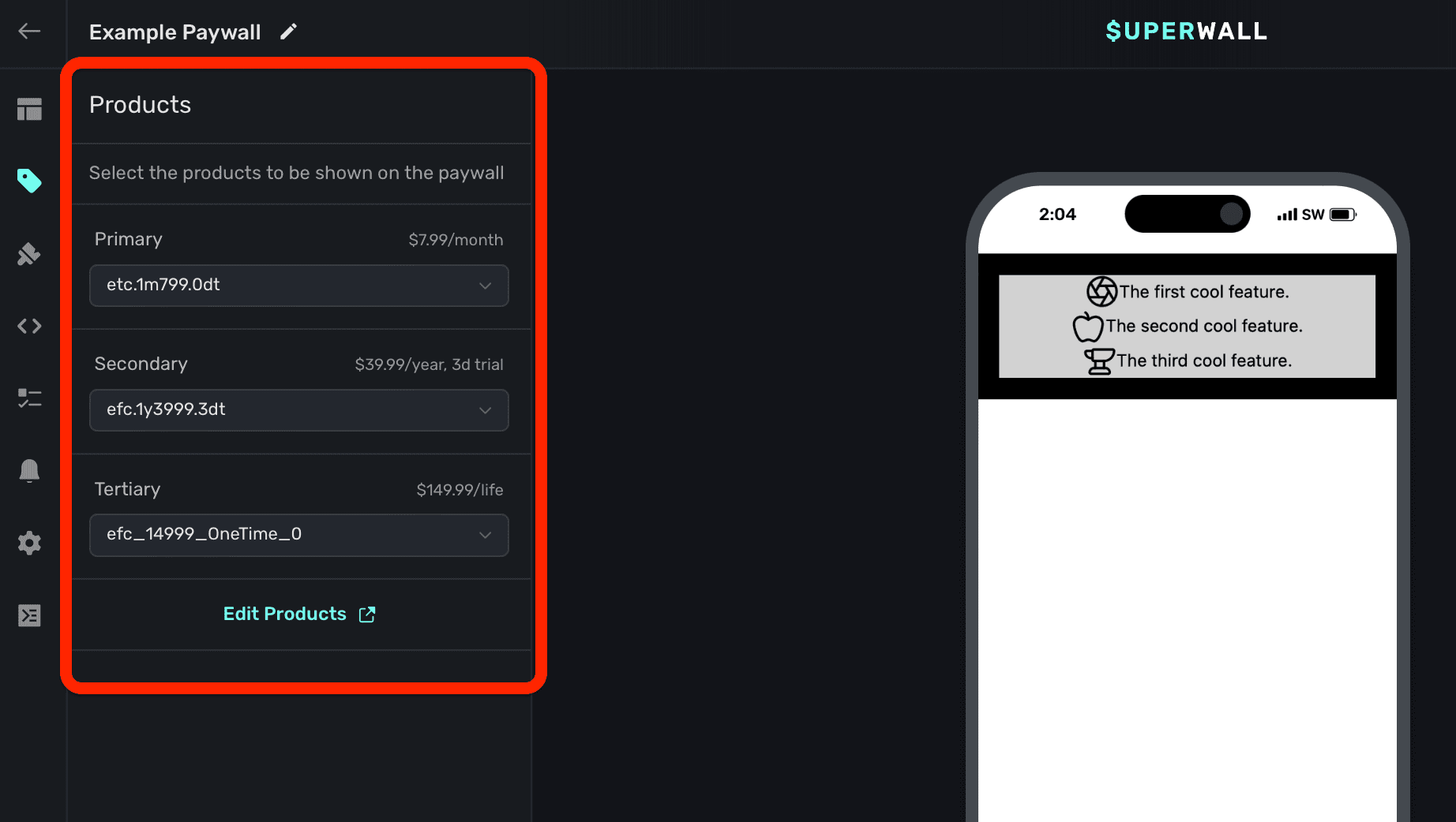 You can display as many products as you see fit on your paywall. Superwall will automatically fill in a name for the first three added ("primary", "secondary", and "tertiary") but you're free to name them anything else. Regardless, the name is used to reference them using Liquid Syntax in the editor. For example, products.primary.price.