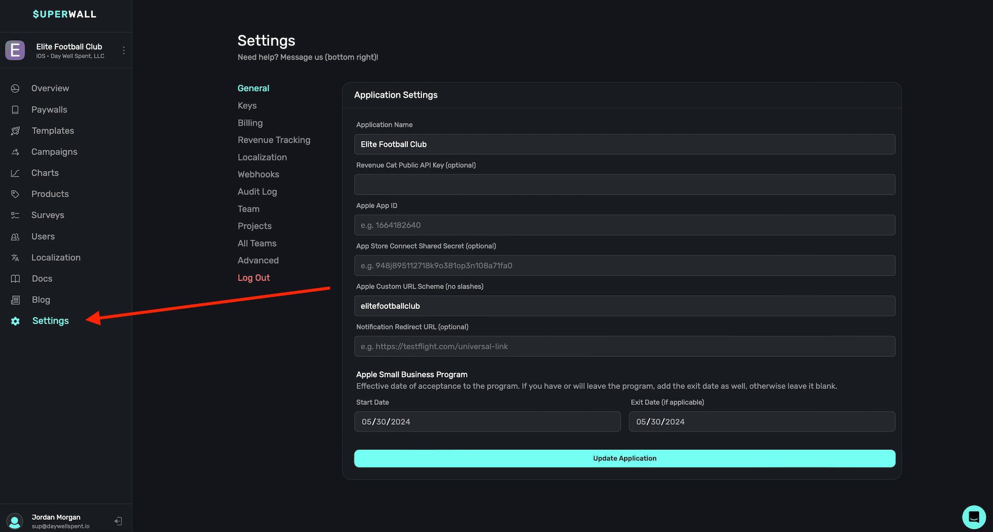 To access settings for your Superwall account, click the Settings button in the sidebar: