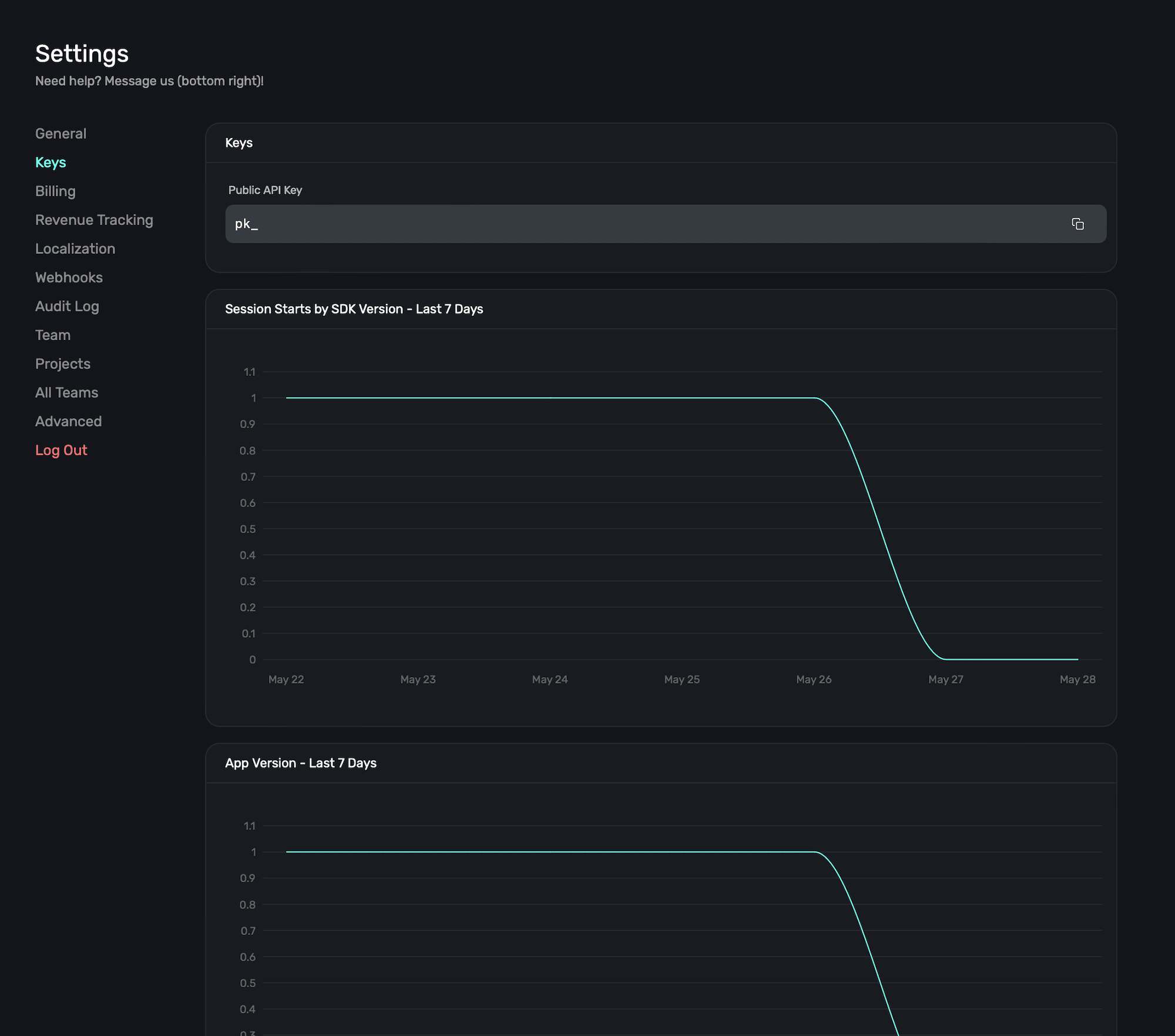 In the Keys section under Settings, you can easily view or copy your API key, view session starts by the last seven days, and app version sessions from the last seven days.
