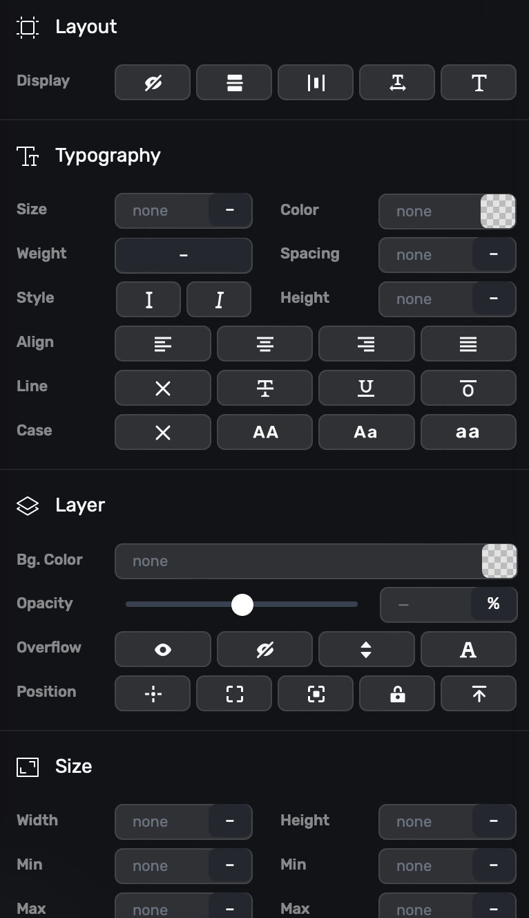 You can customize the layout, typography, layer, size, margin, padding, corners, effects and background image using the fields below the click behavior: