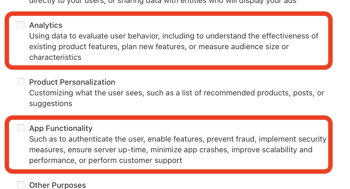 Privacy disclosures in regards to how data is processed or otherwise used are required when submitting an app for review on the App Store. When using the Superwall SDK, there are a few options you'll need to select to comply with this requirement.