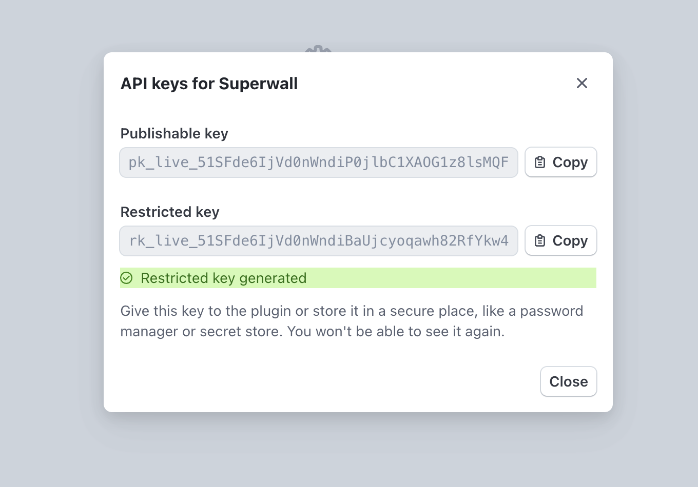 After installation, you'll receive a Publishable Key and a Restricted Secret Key with the proper permissions already configured. Copy both keys: