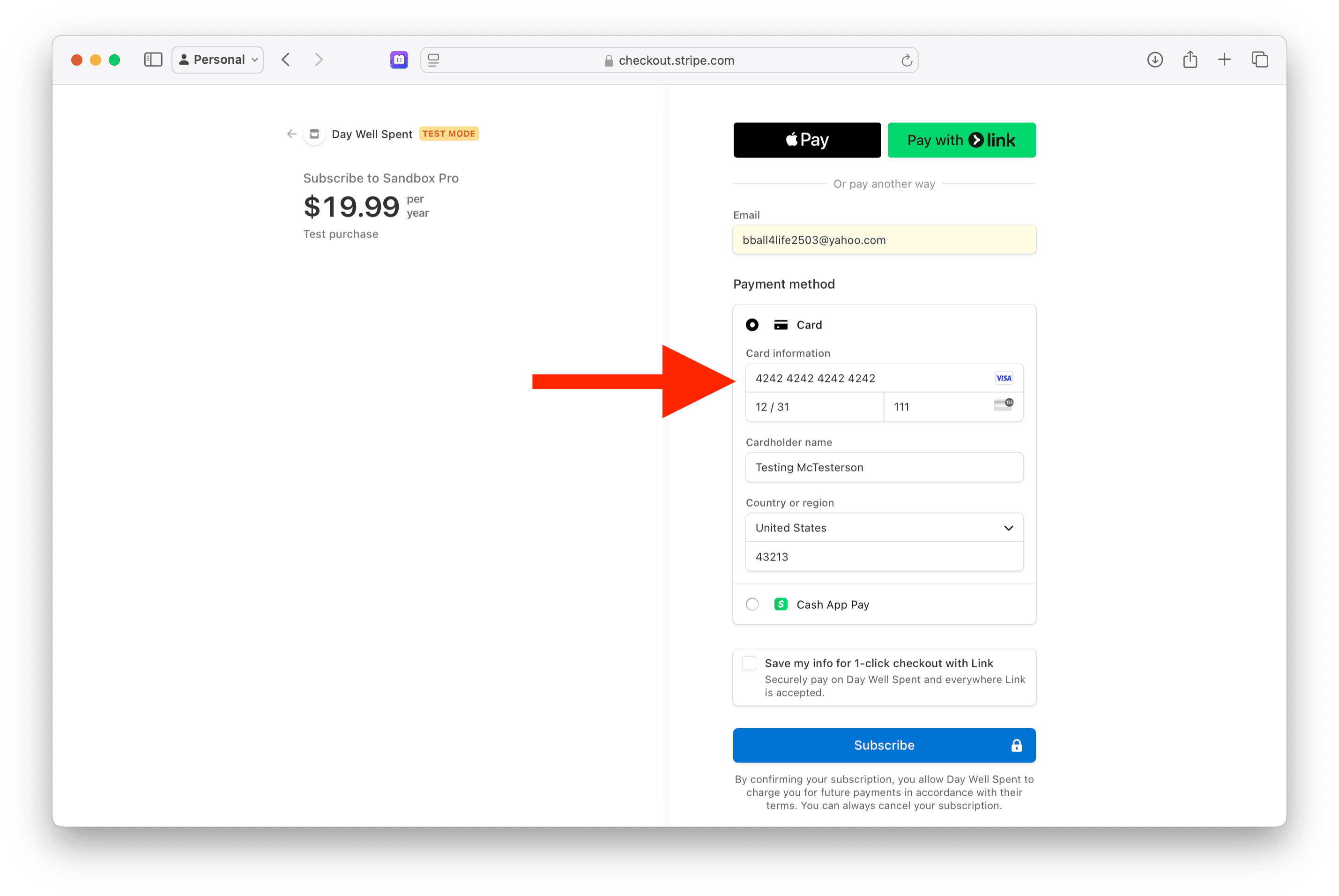 4242 4242 4242 4242with any expiration date later than today, any CVC and fill out the name and zip code.